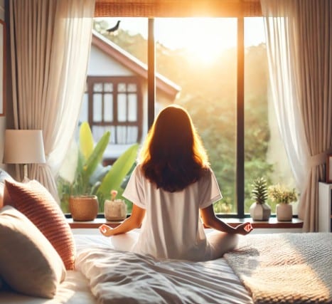 Chaque matin, avant même de quitter mon lit, j’ouvre les volets pour laisser entrer la lumière douce du jour. 🌅 Je m’assois en tailleur, et je médite pendant dix minutes.